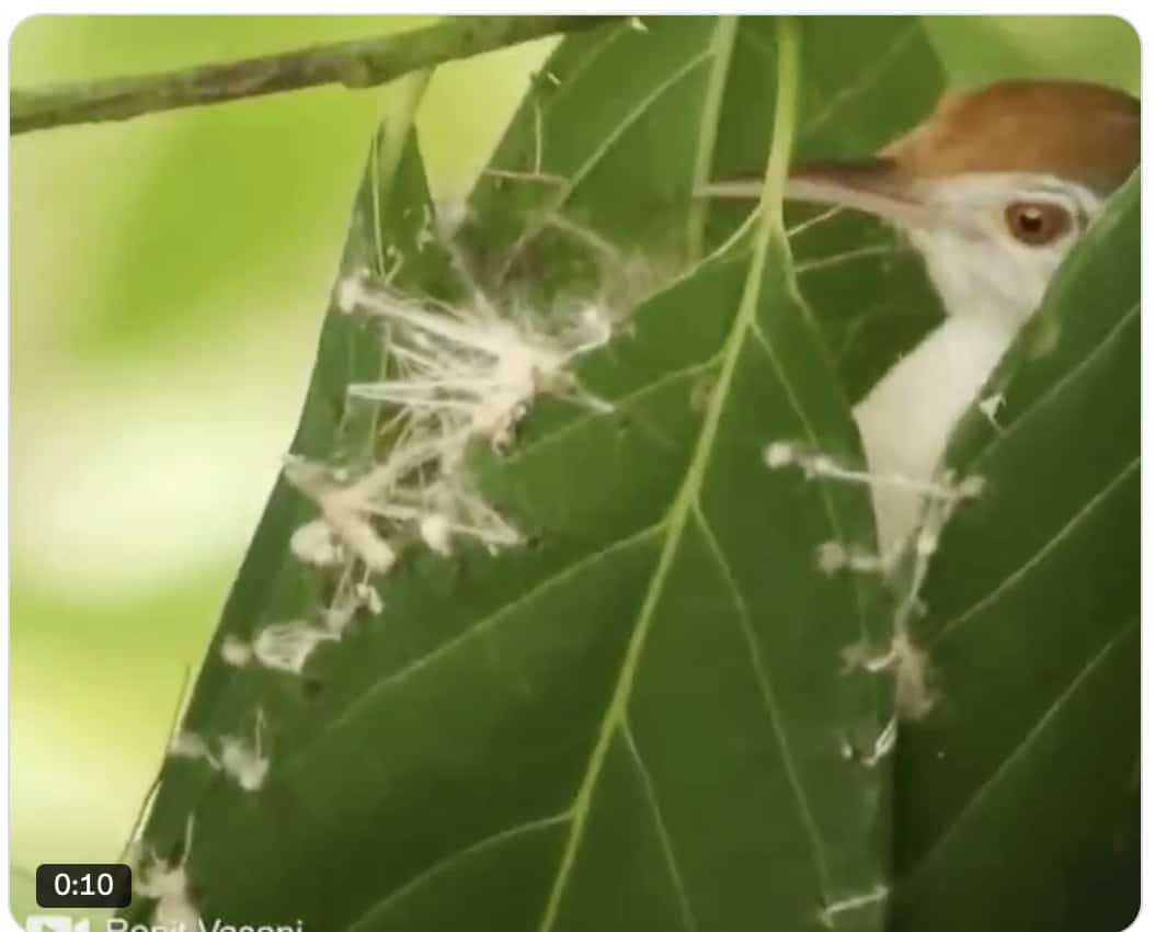 Tighten and repeat: The bird continues this procedure, tightening the seam step by step, until all the leaves are properly stitched together. The end result? An absolutely sewn cradle capable of protecting the eggs from predators, dampness, and prying humans.